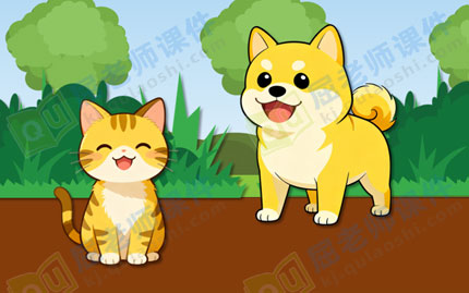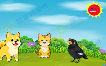 物质: PPT课件,小花猫、小黄狗、八哥的角色头饰若干,欢快和舒缓的背景音乐。